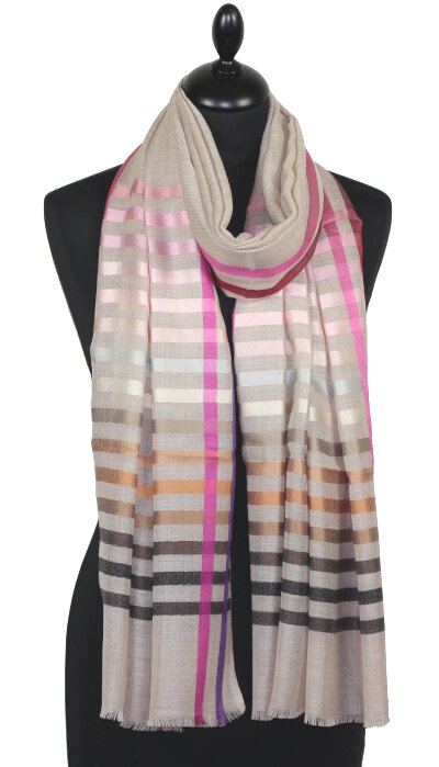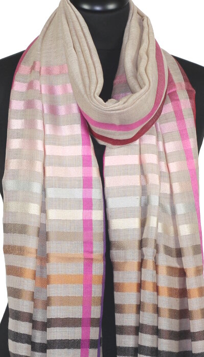 Artisanally made in India, this scarf has a unique texture, blending the softness of wool with the subtle sheen of silk. The silk stripes add refined elegance and a delicate touch of color to each piece.