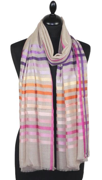 Artisanally made in India, this scarf has a unique texture, blending the softness of wool with the subtle sheen of silk. The silk stripes add refined elegance and a delicate touch of color to each piece.