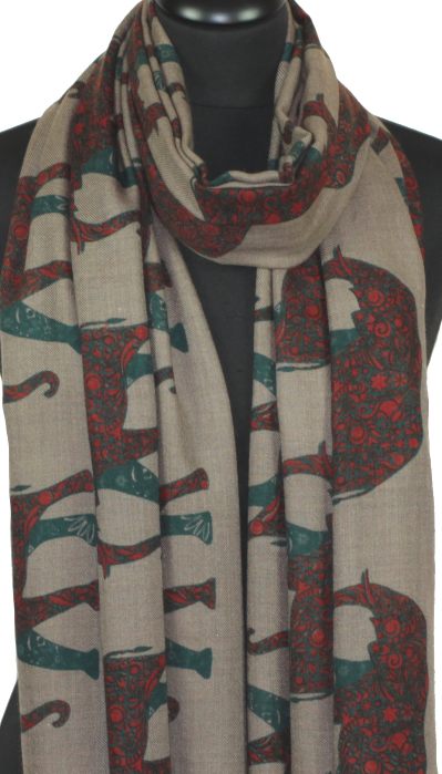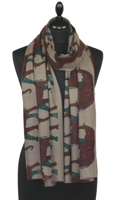 Écharpe en cachemire beige ornée d'éléphants brique et bleu – alliance de douceur, chaleur et savoir-faire artisanal