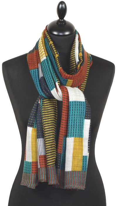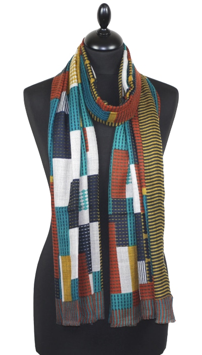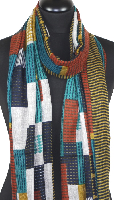 Écharpe en cachemire camel, bleu et brique – alliance de douceur, chaleur et savoir-faire artisanal