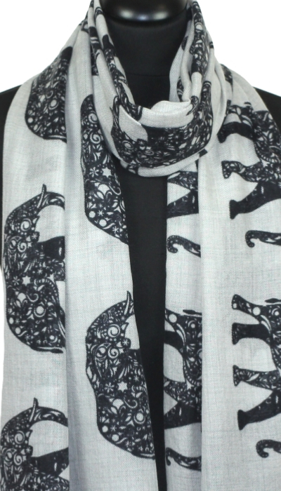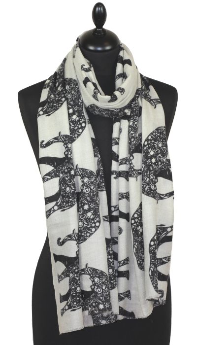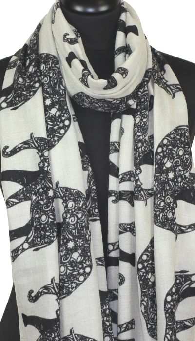 Écharpe en cachemire écru ornée d'éléphants noirs – alliance de douceur, chaleur et savoir-faire artisanal