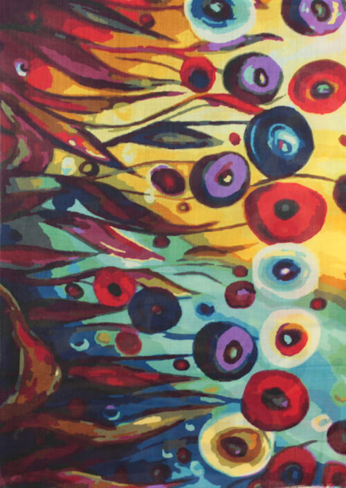 Écharpe Cachemire « Nuit d’Été », aux tons rouge, or et bleu, un motif floral abstrait qui capture la chaleur, la profondeur et l’élégance envoûtante d’une soirée estivale.