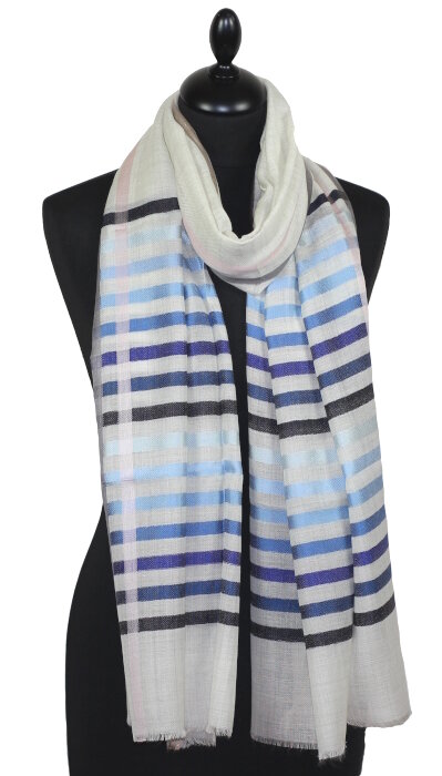Artisanally made in India, this scarf has a unique texture, blending the softness of wool with the subtle sheen of silk. The silk stripes add refined elegance and a delicate touch of color to each piece.