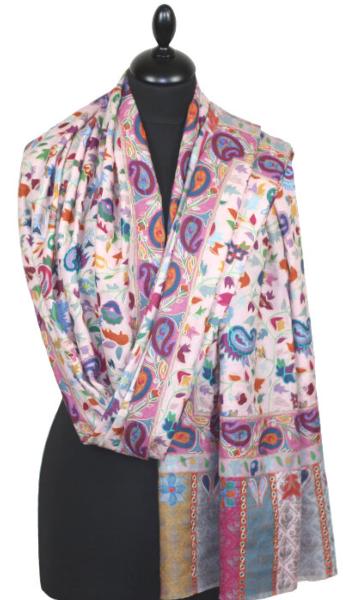 Étole en cachemire rose pâle à motifs floraux brodée – L’élégance raffinée d’un savoir-faire traditionnel