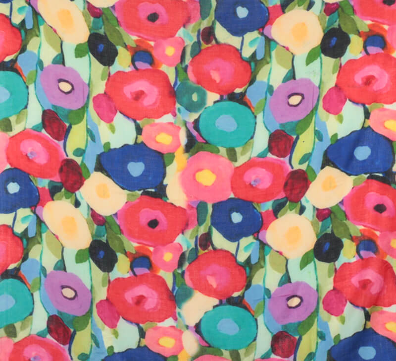 "Flower Field" Wool Square Scarf in blue, red and green, inspired by a poppy motif symbolizing cheerfulness and lightness.