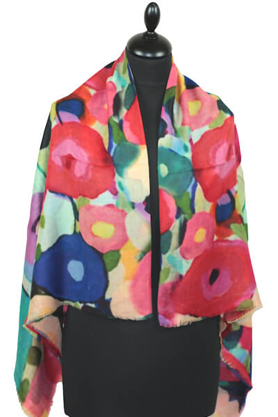 This large wool square scarf, soft and warm, stands out with its bright floral patterns and fine finishing. Lightweight and pleasant to wear, it adds a colorful and refined touch to any outfit.