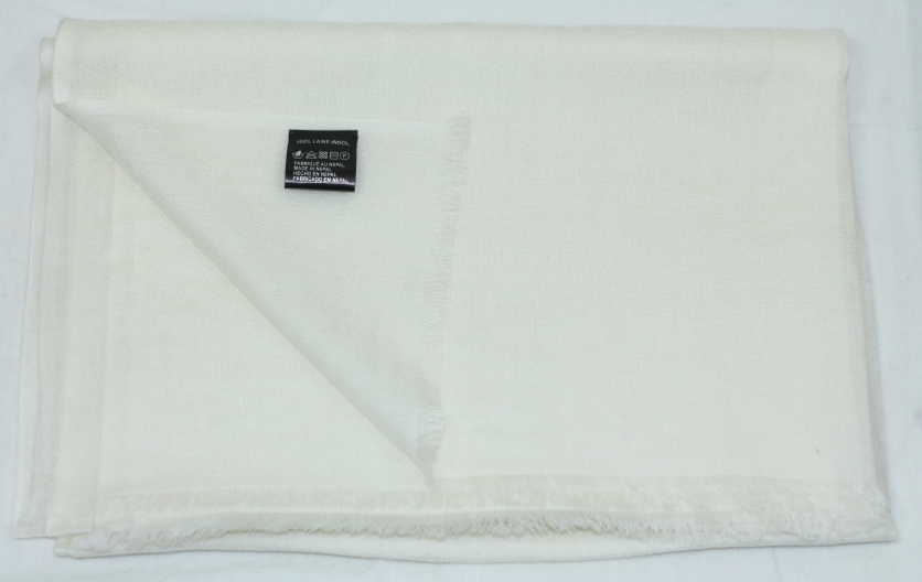 This off-white-colored scarf made from pure wool wraps you in warmth and softness. The wool is sourced from sheep raised in the high altitudes of the Himalayas, a region renowned for the exceptional quality of its natural fibers.
