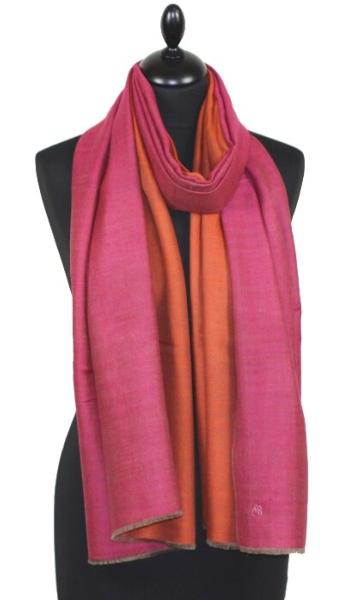 Ce châle pashmina bicolore fuchsia et orange vous enveloppe d'une douceur incomparable, d'une légèreté extrême et, surtout, d'une chaleur agréable et réconfortante. La laine provient des chèvres semi-nomades des hauts plateaux de l'Himalaya, dans des conditions climatiques extrêmes qui façonnent la qualité exceptionnelle de cette matière précieuse. Ce pashmina devient beaucoup plus doux à l'usage, offrant une sensation encore plus agréable au fil du temps.